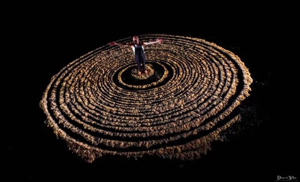 Entre ciel et terre, une danseuse parcourt cet entre-deux, comme si elle cherchait à mesurer ce qui conduit l’un vers l’autre, le ciel et la terre.